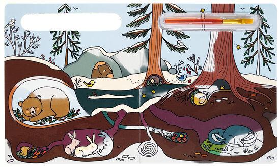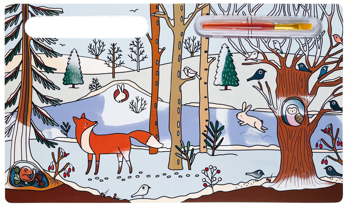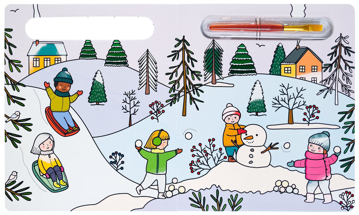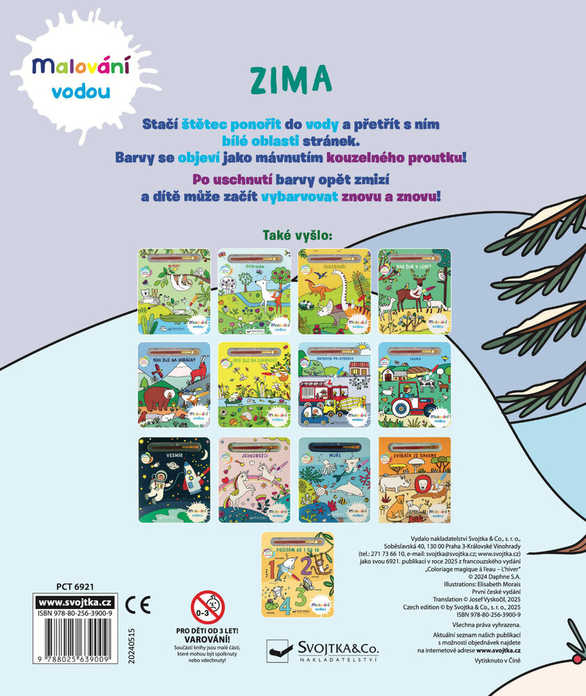 Knížka s pevnými stránkami je plná obrázků s tématem zimy, které jsou částečně barevné. Bílé části lze velice snadno vybarvit - stačí namočit štětec, který je součástí knihy, do vody a barva se jako zázrakem na bílém podkladě objeví. To ale není všechno! Vymalovaný obrázek jako kouzlem zmizí, a tak jej dítě může vymalovávat stále dokola. Zkontrolujte, zda dítě drží štětec správně. S touto knížkou si bude procvičovat jemné motorické schopnosti a koordinaci oka a ruky.