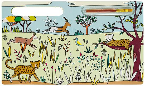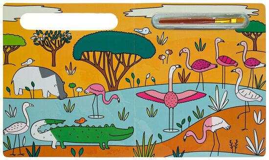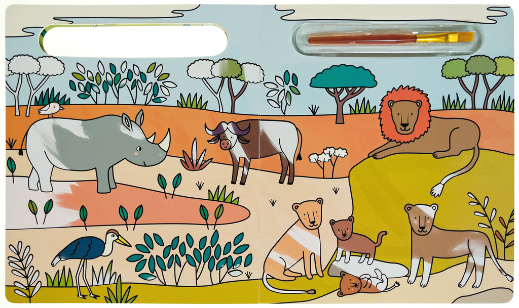 Knížka s pevnými stránkami je plná obrázků zvířat ze savany, které jsou částečně barevné. Bílé části lze velice snadno vybarvit - stačí namočit štětec, který je součástí knihy, do vody a barva se jako zázrakem na bílém podkladě objeví. To ale není všechno! Vymalovaný obrázek jako kouzlem zmizí, a ...