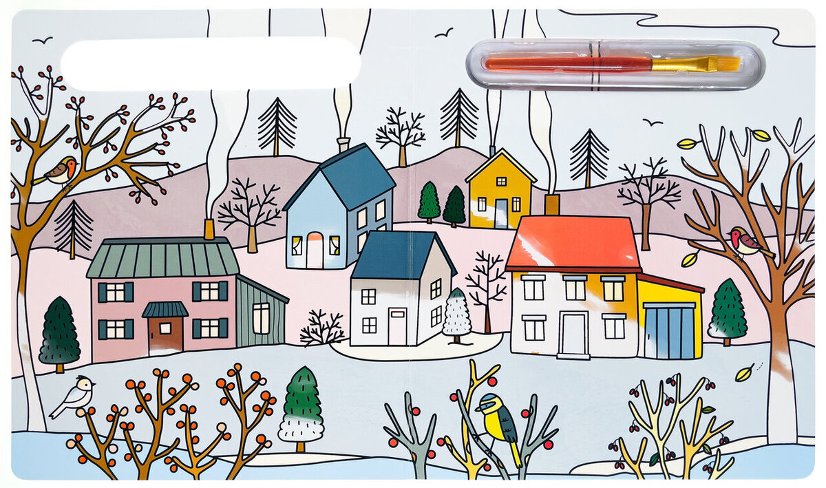 Knižka s pevnými stránkami je plná obrázkov s témou zimy, ktoré sú čiastočne farebné. Biele časti sa dajú veľmi ľahko vyfarbiť - stačí namočiť do vody štetec, ktorý je súčasťou knihy, a farba sa ako zázrakom na bielom podklade objaví. Ale to nie je všetko! Vymaľovaný obrázok ako kúzlom zmizne, a tak ...