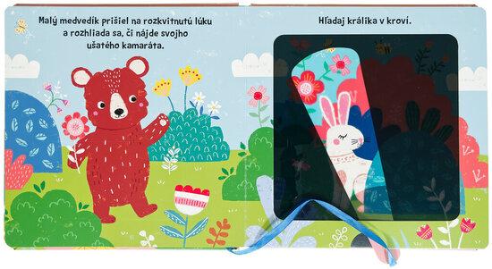 Priprav sa zažiť poriadne dobrodružstvo! Malý medvedík má veľa kamarátov, ktorých stretáva každý deň. Poď ich s ním všetkých pozdraviť. Kam sa však všetci schovali? Vezmi si kúzelnú baterku a pomôž malému medvedíkovi nájsť jeho kamarátov! Uži si veselú hru na schovávačku! Vďaka jeho kúzelnej baterke sa pred ním nikto neschová! Vlož baterku medzi stránku a tmavú fóliu a objav rôzne zvieratá v odlišných scenériách!