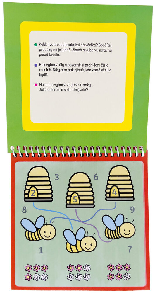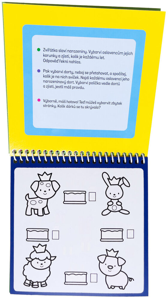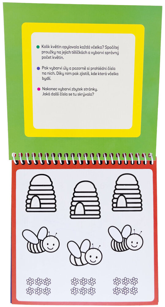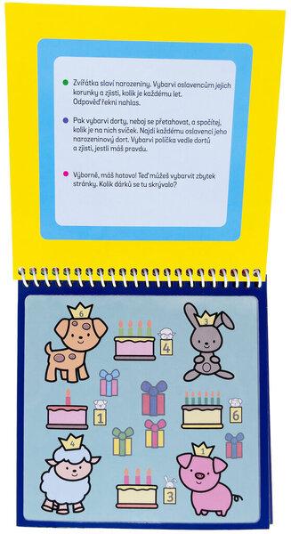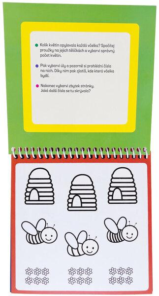 Naplň speciální fix vodou a můžeš stránky této knížky vybarvovat zas a znovu. Na stránkách tě čekají úkoly na procvičování čísel, ale také počítání. Dokážeš spočítat, kolik motýlů se schovává na stránce? Dokážeš pojmenovat všechny barvy a poznáš, co se skrývá v obrázku plném čísel? Jakmile voda uschne, barvy zmizí a ty můžeš vybarvovat a řešit úkoly pořád dokola!