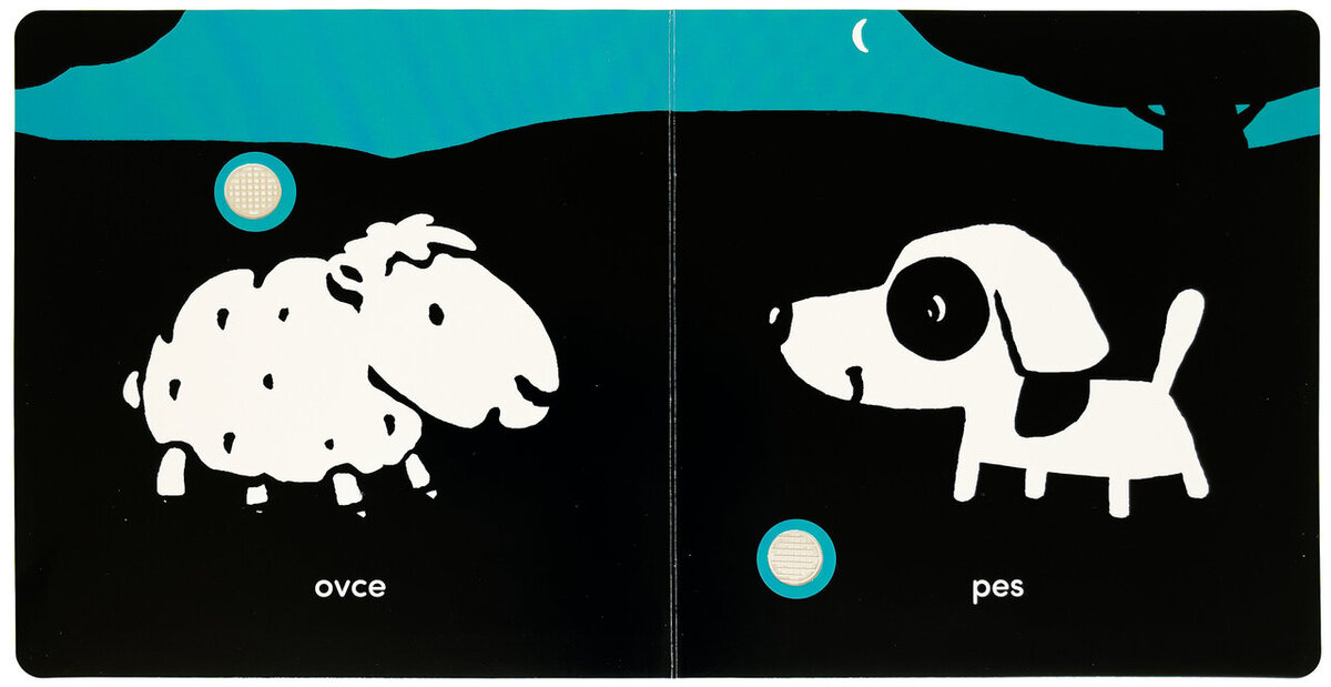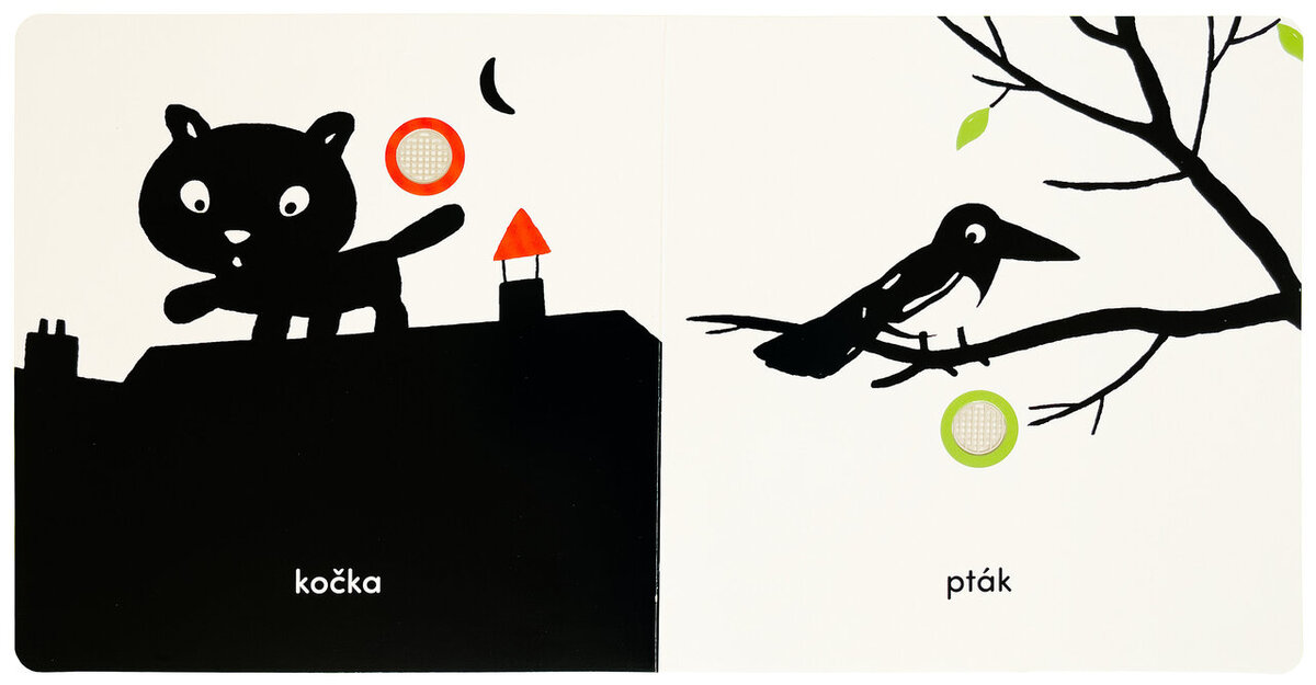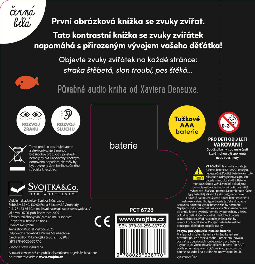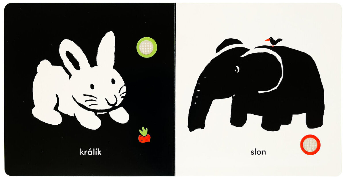 Tato kontrastní zvuková knížka je ideální první knihou pro nejmenší děti. Obsahuje 10 zvukových tlačítek se zvířátky, jako jsou kočka, slon, pes nebo kráva. Stisknutím tlačítka si děti poslechnou autentické zvuky a budou se učit spojovat obrázek s hlasem zvířete. Jednoduché černobílé ilustrace podporují vývoj zraku a zvuková interakce pomáhá rozvoji sluchu i jemné motoriky. Díky pevným stránkám je knížka vhodná i pro malé dětské ručičky. Skvělý společník do postýlky, kočárku i na cesty!