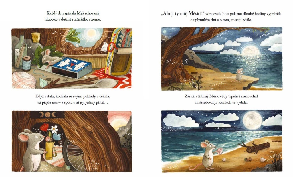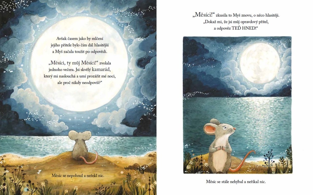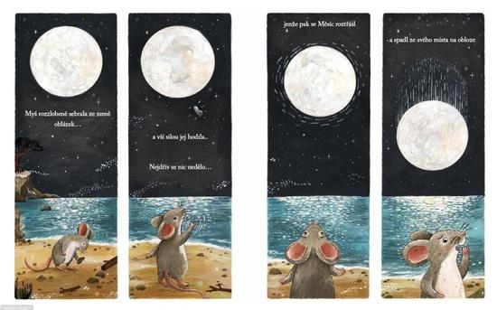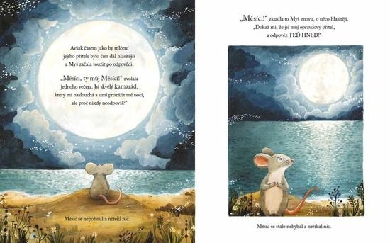 Myš každý večer s oblibou vypráví Měsíci o svých nápadech a snech. Věří totiž, že jsou na celém širém světě sami. Když se Měsíc jednoho dne zřítí do hlubin nekonečného oceánu, Myš se vydá svého jediného přítele zachránit. Ukáže se však, že se po třpytivé záři Měsíce nestýská jen jí. Zvířata spojí síly, aby ho vrátila na oblohu, a Myš díky tomu spatří Měsíc – i svět kolem – v úplně novém světle…