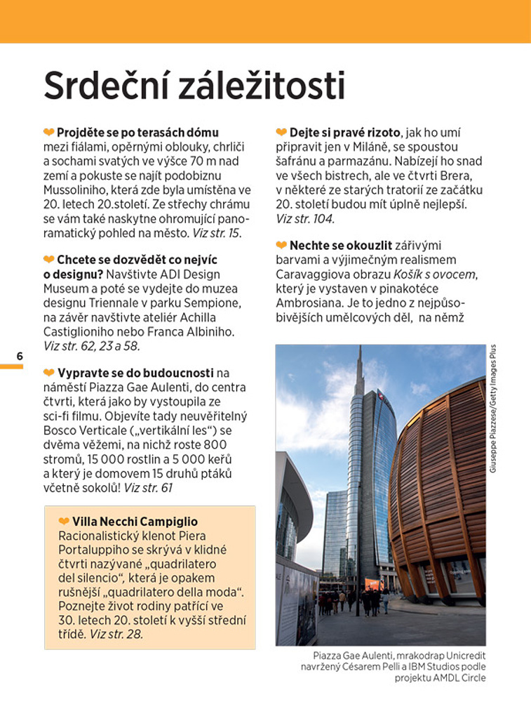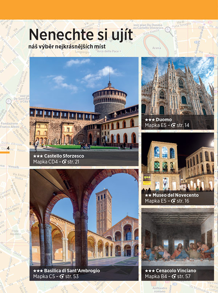 S orientací po městě vám pomohou plánky větších čtvrtí, doporučená místa jsou označena na mapkách čtvrtí barevnými terčíky s číslem. Červeně uvedené souřadnice (např. C2) odkazují na podrobnou rozkládací mapu Milána (vloženou vzadu v průvodci).
