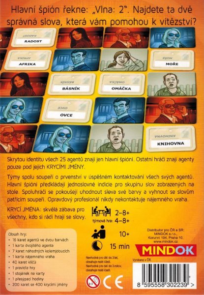 Hlavní špión řekne: "Vlna 2". Najdete ta dvě správná slova, která vám pomohou k vítězství? Skrytou identitu všech 25 agentů znají jen hlavní špióni. Ostatní hráči znají agenty pouze pod jejich KRYCÍMI JMÉNY . Týmy spolu soupeří o prvenství v úspěšném kontaktování všech svých agentů. Hlavní špióni ...