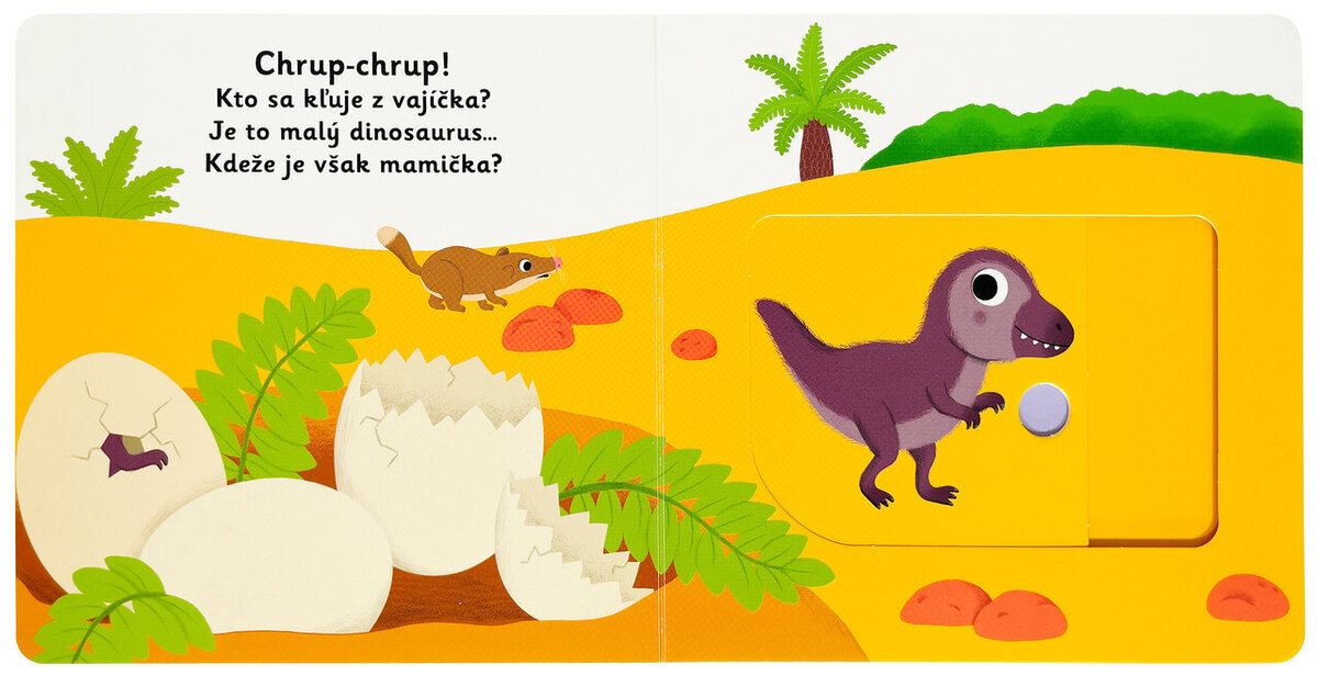 Dinosaurík odvážny neľaká sa samoty. Vie, že mama sa už blíži. Uteká jej v ústrety! Spoznajte príbeh o malom dinosaurovi v tomto veršovanom leporele s milými ilustráciami a pohyblivými prvkami. Objavovať svet s týmto leporelom pre najmenšie deti od jedného roku je také zábavné! Pevné stránky s pohyblivými prvkami precvičia aj jemnú motoriku. Stačí len vložiť prstík do správneho otvoru a ľahko vysunúť, zatiahnuť alebo otočiť a hneď bude váš malý objaviteľ poznať odpoveď na to, ako prebieha deň malého dinosaura.