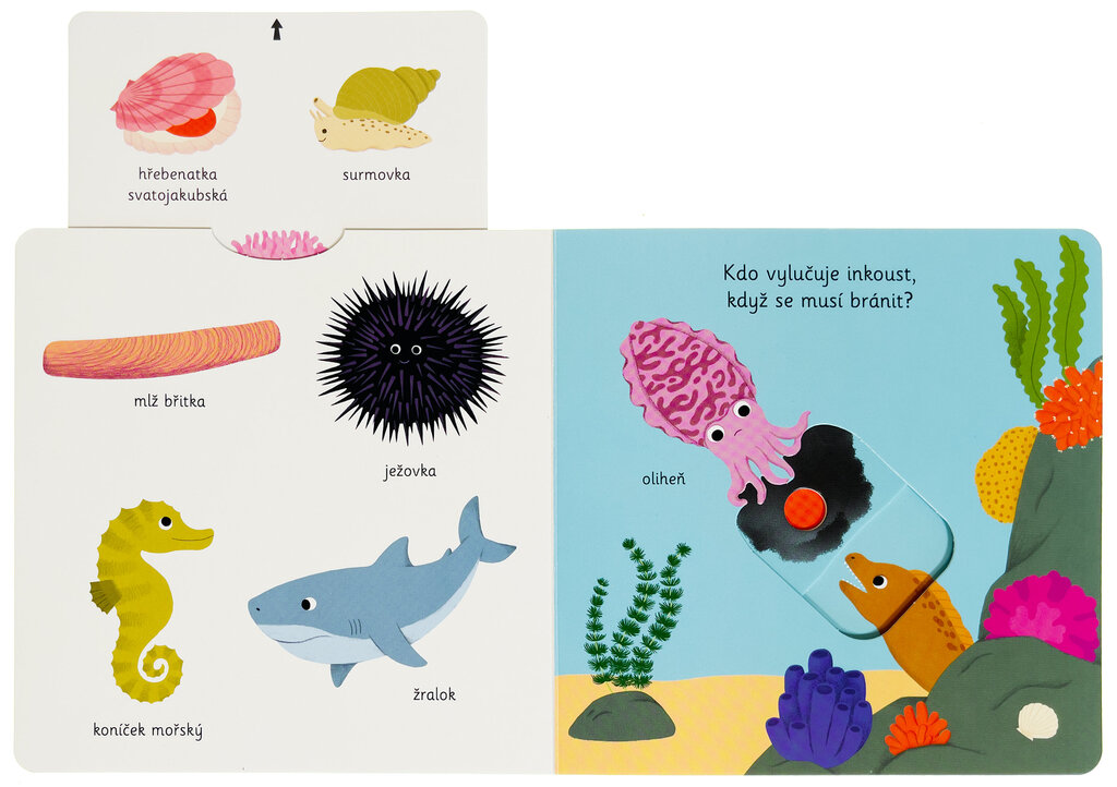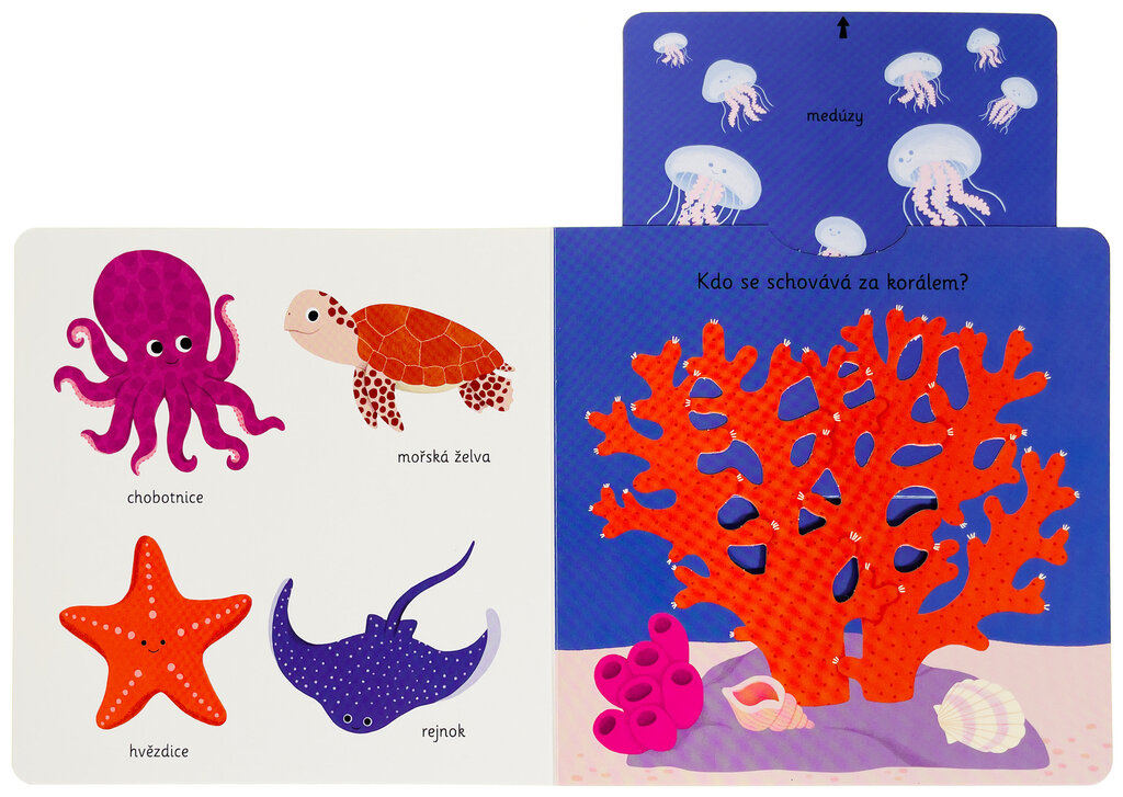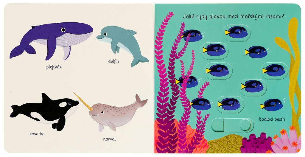 Objevovat oceán a mořské živočichy je s tímto leporelem tak zábavné! Kdopak našel nový domeček v ulitě? Kdo plave mezi mořskými řasami a kdo se to schovává za korálem? Stačí jen vložit prstík do správného otvoru a lehce vysunout nebo zatáhnout a hned bude váš malý objevitel či malá objevitelka znát odpovědi. Leporelo je určeno pro nejmenší děti a má pevné stránky s posuvnými prvky, a tak si naši nejmenší mohou při prohlížení a poznávání mořských živočichů procvičit i jemnou motoriku. Knížka s prvky Montessori.