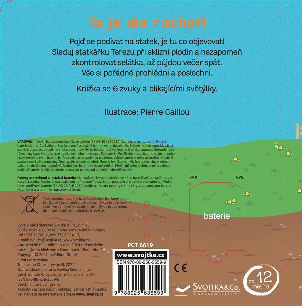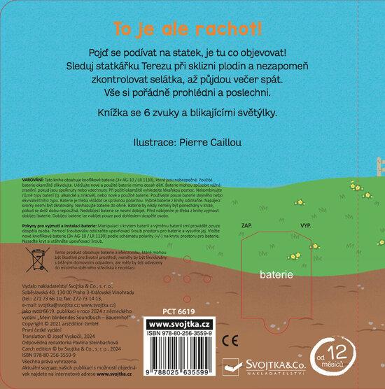 Vítej na farmě u farmářky Terezy. Pojď se podívat, co všechno se tu dnes děje. Sleduj farmářku Terezu při sklizni plodin a pomoz nakrmit slepice. Zjisti, jak dělá kombajn a kam putuje čerstvě nadojené mléko. Poslechni si traktor, cisternu a kombajn a nezapomeň zkontrolovat selátka, až půjdou večer spát. V knize na tebe čeká 6 zvuků a blikající světýlka.