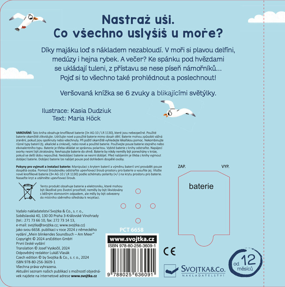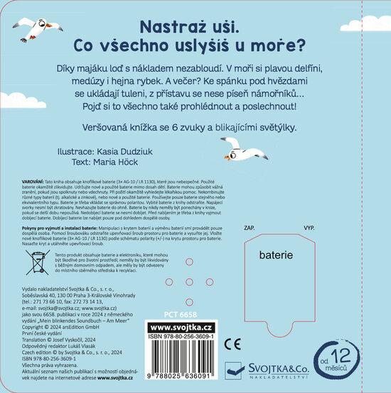 Teplé letní počasí láká k výletu u moře. Pojď zjistit, co všechno se dá pozorovat a zažít na pláži nebo třeba v přístavu. Díky majáku loď s nákladem nezabloudí. V moři si plavou delfíni, medúzy i hejna rybek. A večer? Ke spánku pod hvězdami se ukládají tuleni, z přístavu se nese píseň námořníků… Pojď si to všechno také prohlédnout a poslechnout v této veršované knížce se zvuky a blikajícími světýlky!