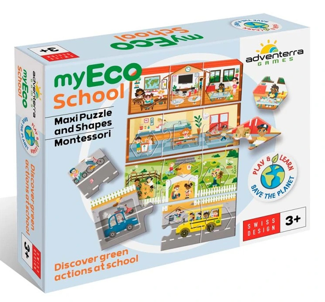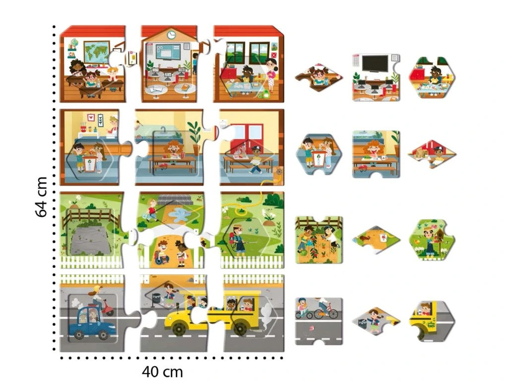 Sestav 4 puzzle a postav si svoji školu. V jednotlivých místech najdi příklady nesprávného chování, které ohrožuje naši planetu a oprav je použitím správných geometrických útvarů. Obsah: 12 puzzle, 12 geometrických útvarů, návod. Rozměr složeného puzzle: 640 x 400 mm. Rozvíjí a podporuje: ...