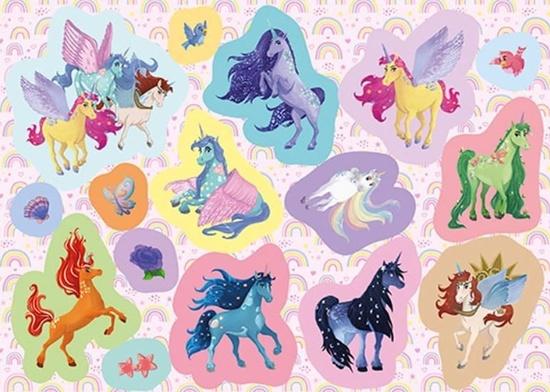 Omalovánky obsahují 24 originálně tvarovaných stran černobílých obrázků k vybarvení a 2 listy samolepek k dolepení.