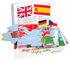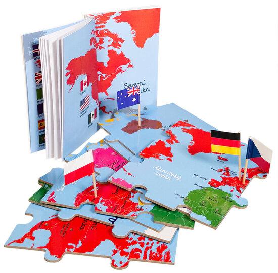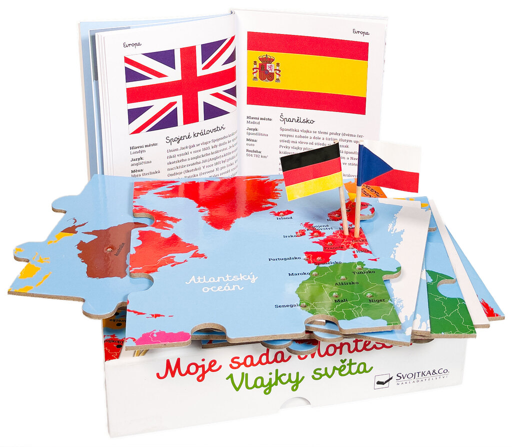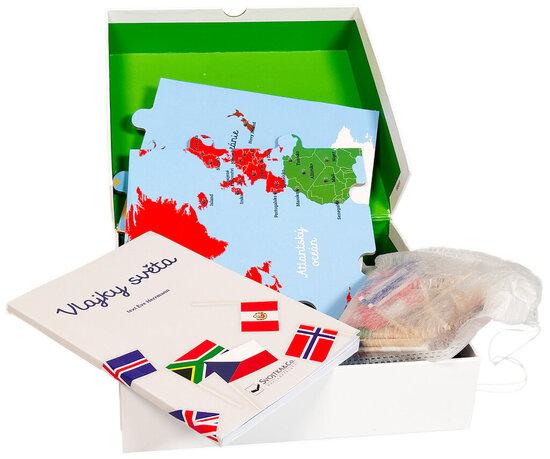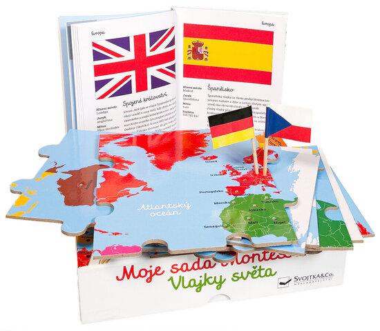 Obsah balení: 1 mapa světa ve formě puzzle o 8 velkých dílcích; 50 miniaturních vlaječek na špejli, určených k zapíchnutí do mapy; knížka o vlajkách a státech, obsahující též návod k aktivitám s pomůckou.