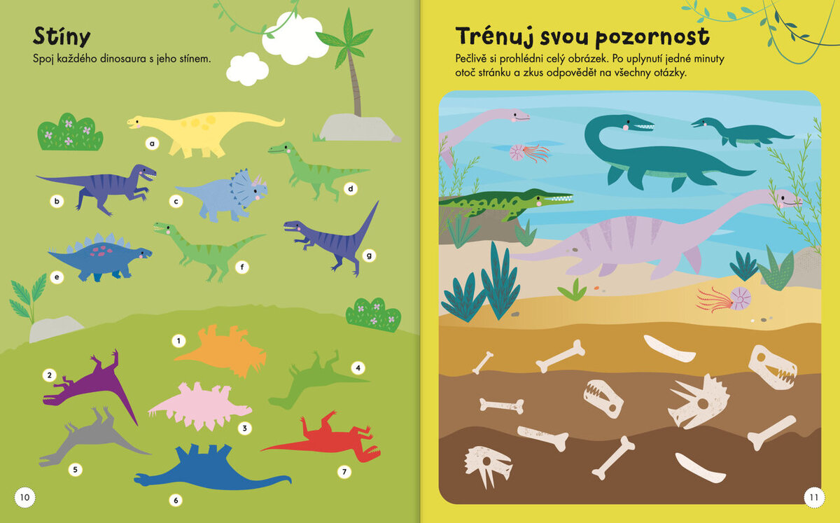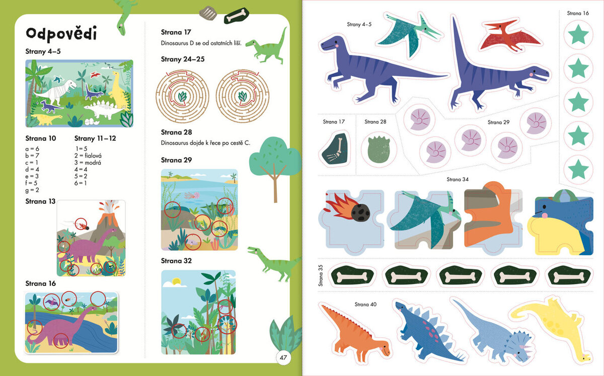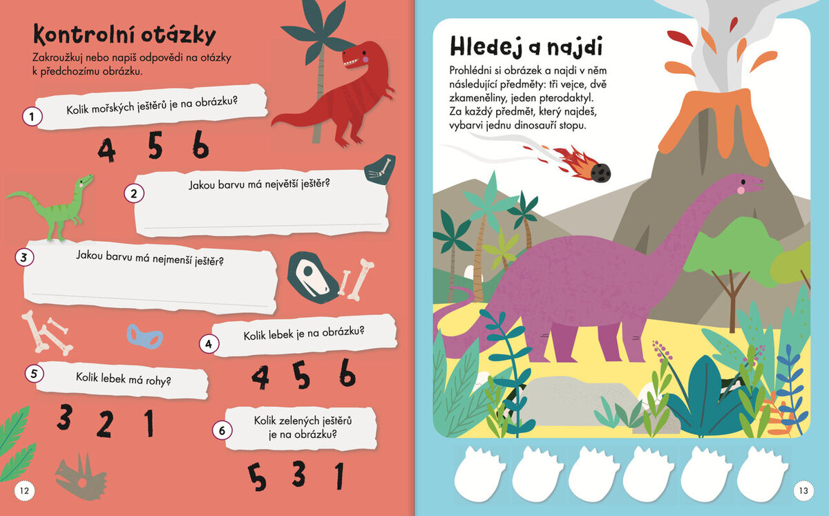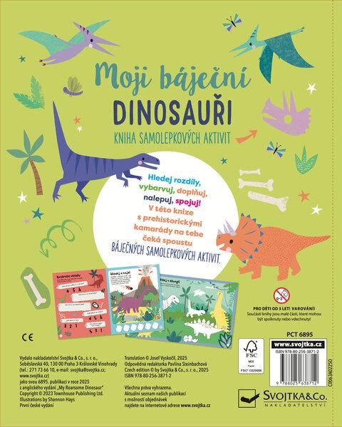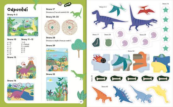 Kniha samolepkových aktivit je plná zábavných úkolů a samolepek k nalepení. Uvnitř knihy se děti seznámí s dinosaury, zatímco budou hledat rozdíly, doplňovat, procházet bludišti, spojovat, kreslit a nalepovat samolepky. Při těchto činnostech si dítě zároveň zlepší koordinaci oka a ruky, jemnou motoriku a soustředění. Tak hurá na výpravu za prehistorickými tvory, zábava může začít!