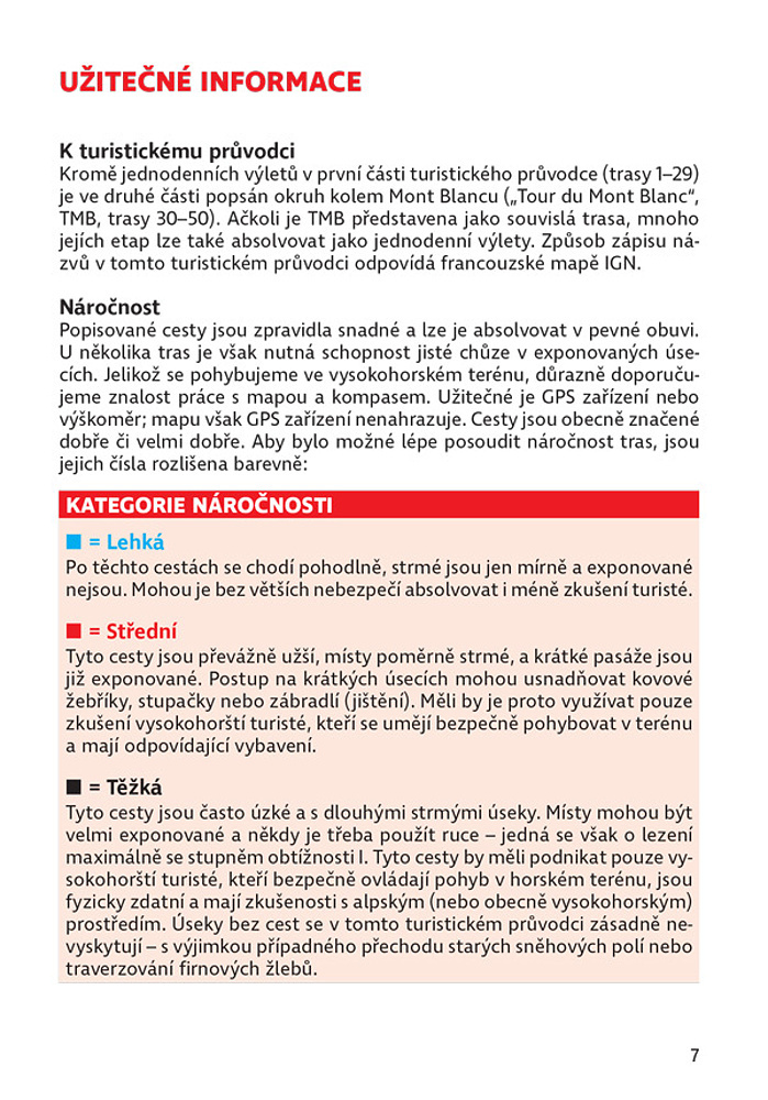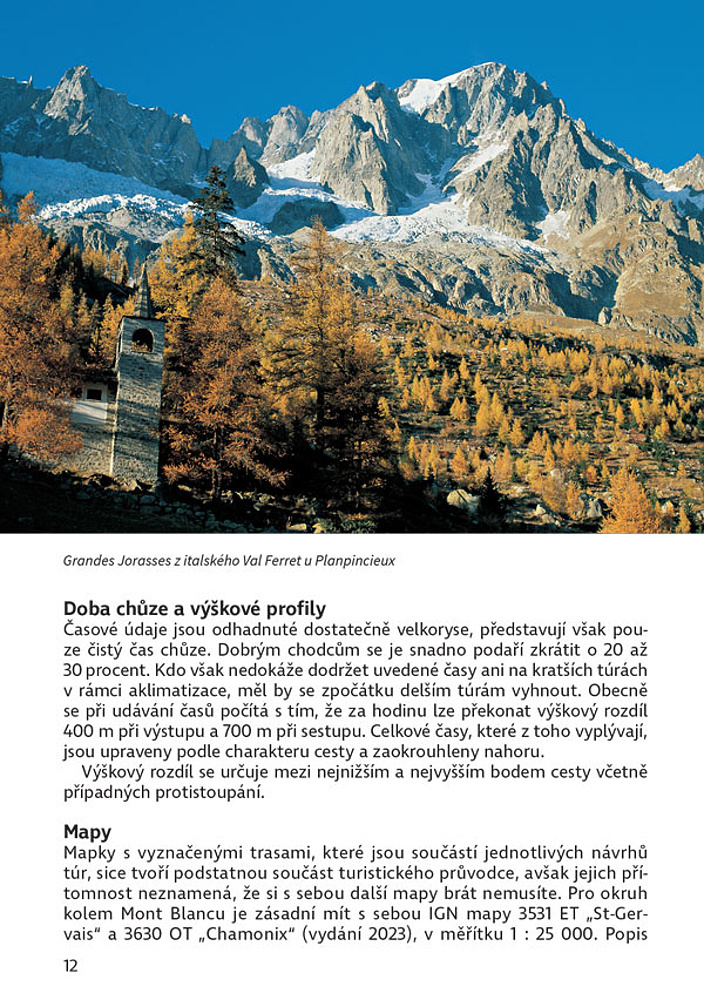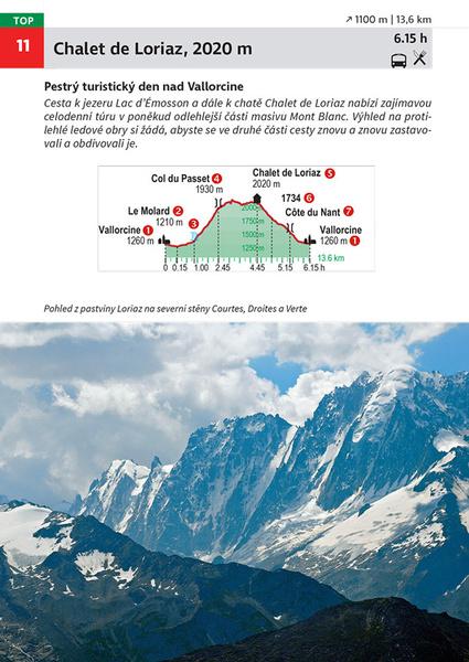 Autor Hartmut Eberlein navštěvuje oblast okolo Mont Blancu již 50 let, a tak vám jeho kniha bude jistě dokonalým průvodcem. V úvodu vám představí region a podělí se o praktické rady a tipy. Následuje popis 50 tras, které zahrnují informace o možnostech ubytování a občerstvení, upozornění na případné překážky a také tipy, jak se na danou túru co nejlépe připravit. Trasy jsou pro přehlednost rozděleny dle náročnosti do tří barevných kategorií (modrá, červená, černá) dle délky, převýšení a nároků na fyzickou kondici či orientační smysl.