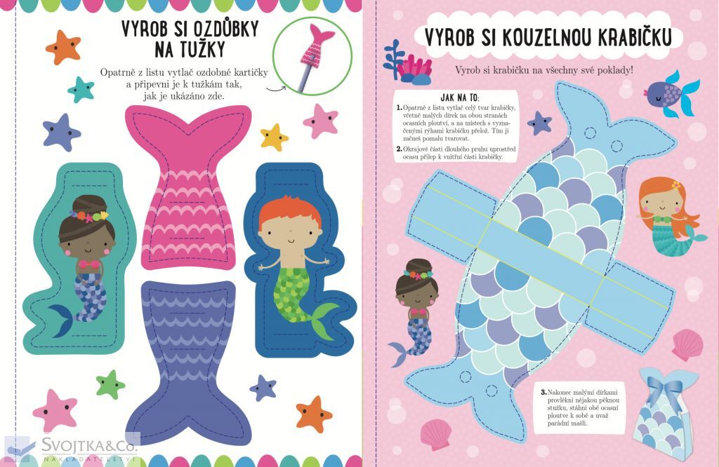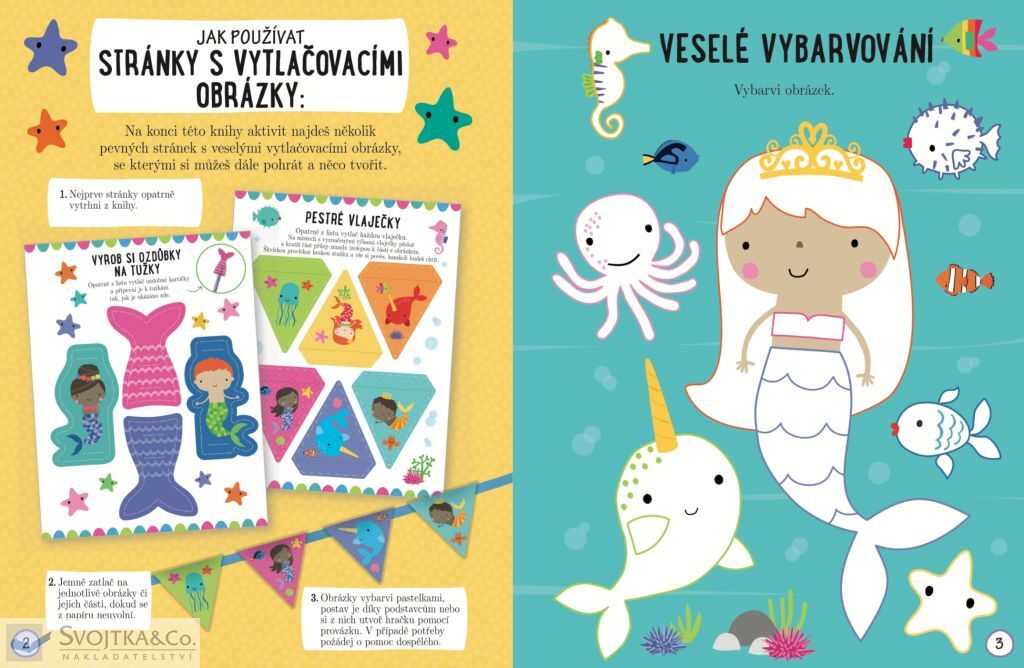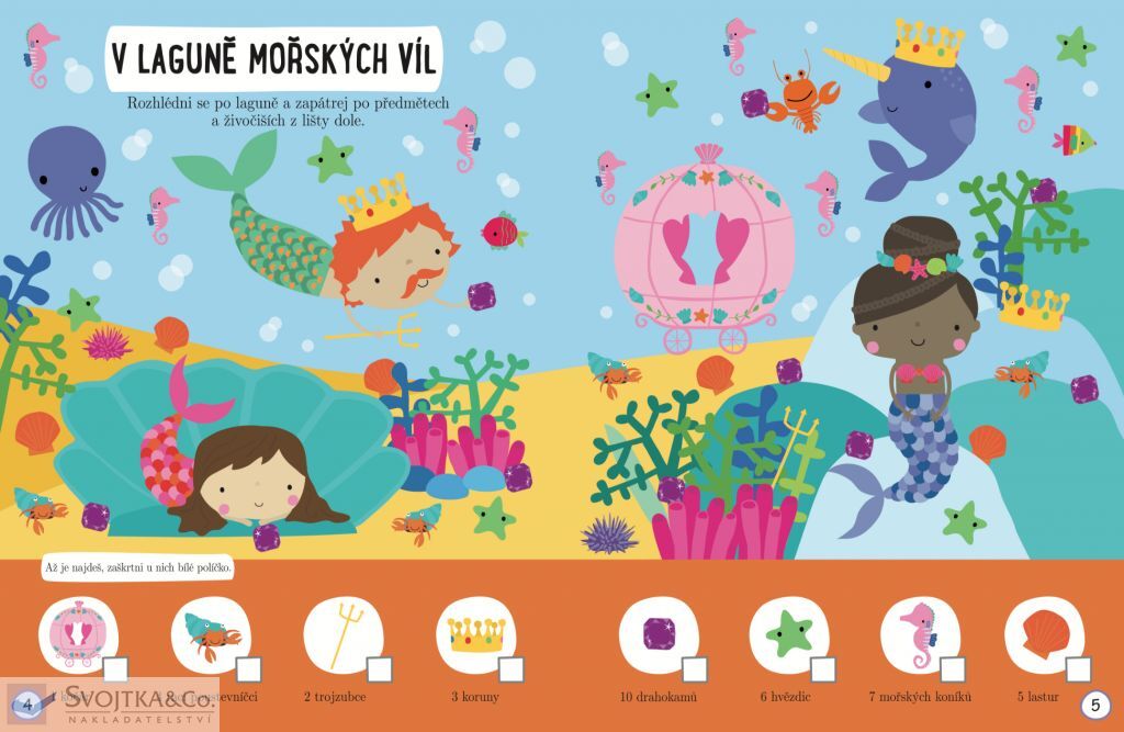 Vstup do světa mořský víl a tritonů, jejich mužských protějšků, a užij si s nimi spoustu zábavy! Tvoji noví kamarádi ti představí svět plný veselého vybarvování, podmořského hledání či plavání mezi korály. Tento sešit obsahuje nejen krásné obrázky k dotvoření a hry, do kterých můžeš plstěné samolepky lepit dle vlastní fantazie, ale také několik stran s vytlačovacími ozdůbkami na tužky, kouzelnou krabičkou na poklady, záložkami, a dokonce i vlastním podmořským palácem. Rozhodně neváhej a pojď si užít kopu legrace se svými novými mořskými kamarády.