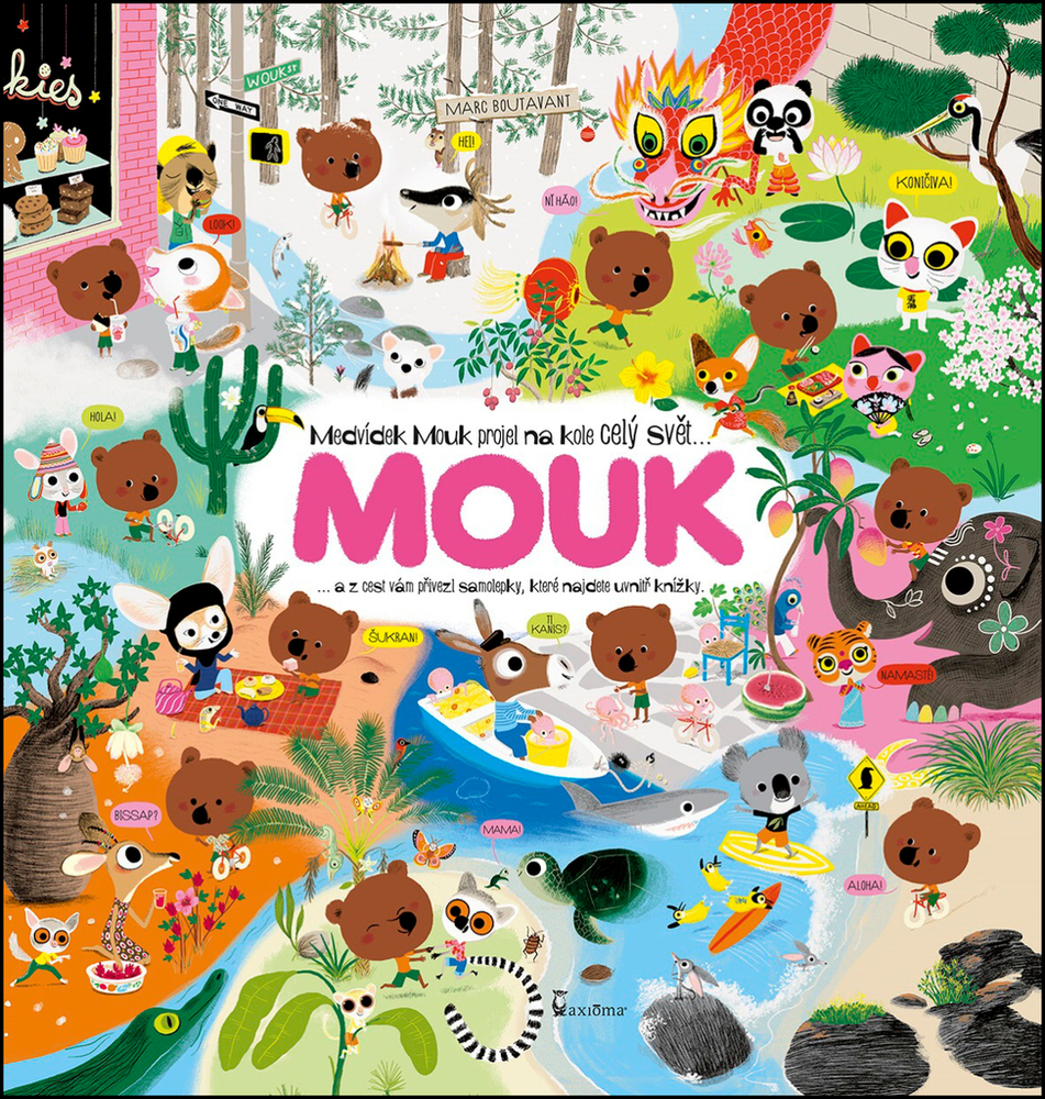 Medvídek Mouk opouští své kamarády... je čas vypravit se na cestu kolem světa, samozřejmě na kole. Na této dobrodružné cestě se Mouk zastavuje na místech se zvláštními jmény: Laponsko, ostrov Hydra, Klokaní ostrov...