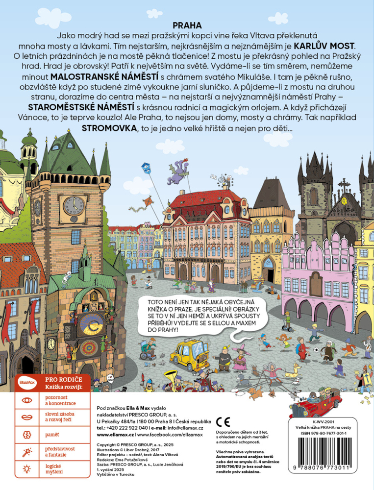 Tuhle knížku lze díky praktickému formátu na cesty vzít všude s sebou! V krásných barevných obrázcích mohou „číst“ i ti, kdo ještě neumějí písmenka. Děti se tu zábavnou formou seznámí s naším hlavním městem Prahou a zároveň budou rozvíjet základy svých předčtenářských dovedností.