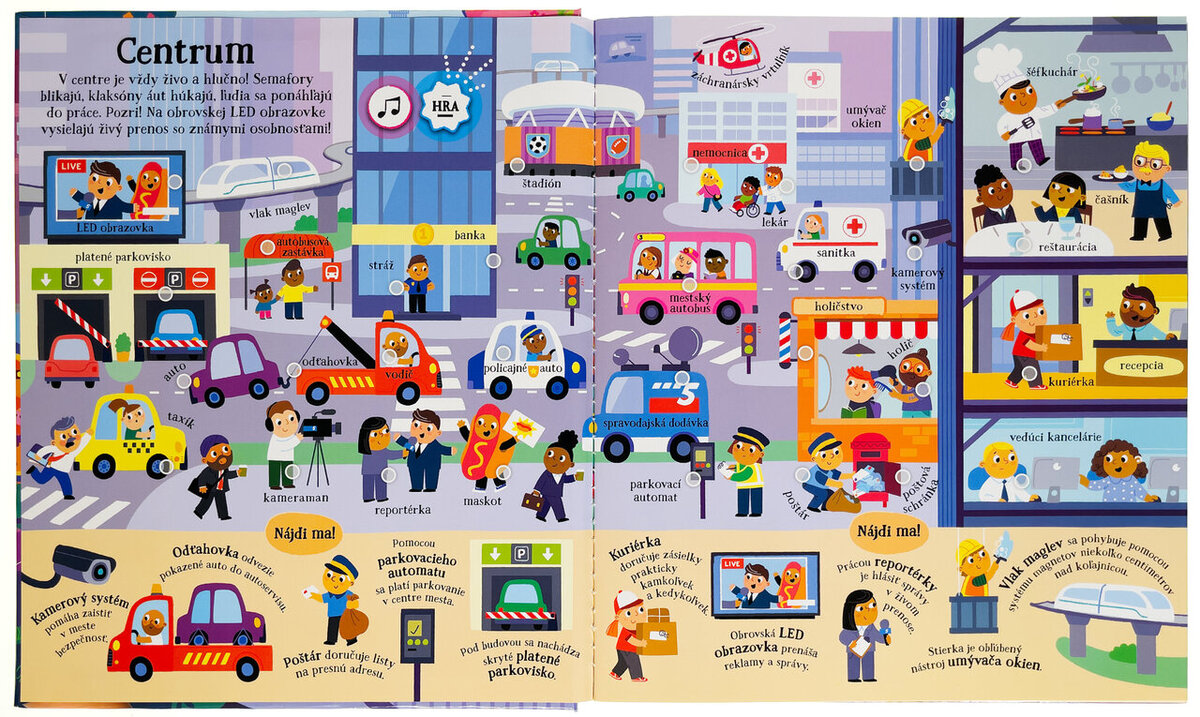 Objavujte na stránkach tejto úžasnej zvukovej knižky vyše 200 zvukov z mesta! Celé mesto na stránkach doslova ožije, hneď ako pri ilustráciách stlačíte vyznačené miesto. Táto kniha obsahuje skutočné zvukové prvky aj nahovorené názvy miest, vecí, pamiatok či budov. Kniha je teda pre malé deti taká zaujímavá a interaktívna, že nepotrebujú ani žiadneho dospelého, ktorý by im názvy musel predčítať! V knihe sa dozviete informácie a zaujímavosti o stavbách, vozidlách aj ľuďoch s rôznymi zamestnaniami, a dokonca viac ako 70 obrázkov môžete hľadať v režime "hry". Na nič teda nečakajte, poďte sa zoznámiť s mestom a objavujte, aké zvuky v ňom nájdete.