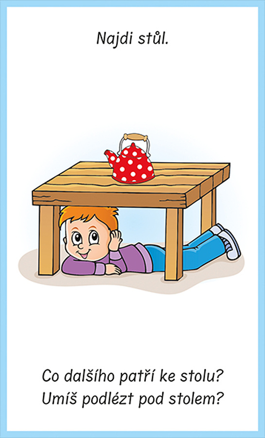 Hra s 50 úkoly pro děti od 3 let rozvíjí logické uvažování, jazykové schopnosti a motoriku. Úkolem dětí je najít různé věci v domácnosti a odpovědět na otázky. Karty jsou výbornou vzdělávací pomůckou pro děti od 1 roku až do školního věku. Jsou uloženy v pevné krabičce s uzávěrem na suchý zip.