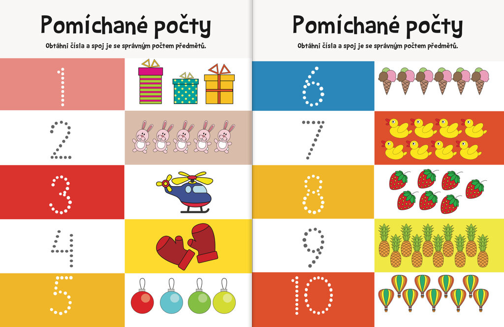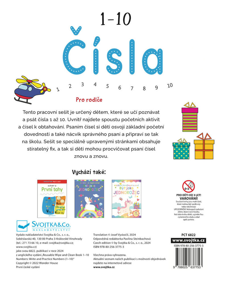 Tento pracovní sešit je určený dětem, které se učí poznávat a psát čísla 1 až 10. Uvnitř najdete spoustu početních aktivit a čísel k obtahování. Psaním čísel si děti osvojí základní početní dovednosti a také nácvik správného psaní a připraví se tak na školu. Sešit se speciálně upravenými stránkami obsahuje stíratelný fix, a tak si děti mohou procvičovat psaní čísel znovu a znovu.