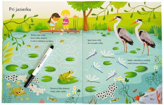 Spoznaj zvieratá i rôzne prírodné prostredia a rieš pritom úlohy. Hľadaj rozdiely medzi slimákmi, preveď cez bludisko veveričku, dokresli baranovi rohy a spočítaj hviezdy na oblohe. Pri plnení úloh používaj stierateľnú fixku, môžeš sa tak k úlohám vracať znova a znova. Deti si s touto knihou aktivít precvičia sústredenie, postreh, písanie rovných a kľukatých čiar a počítanie.