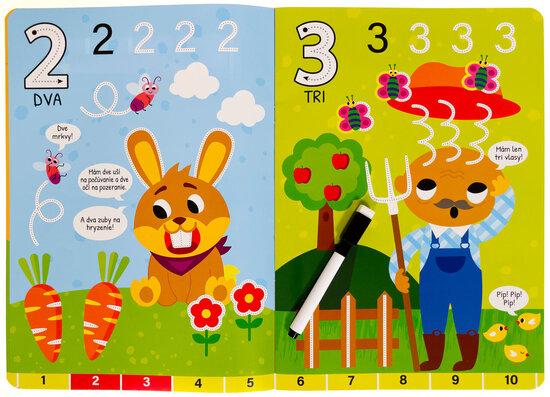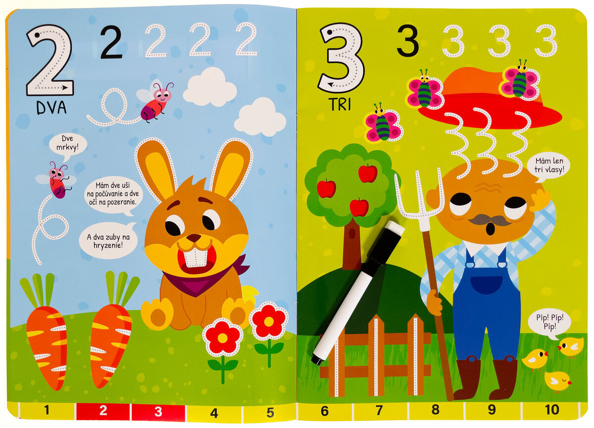 Obťahuj čiary, píš čísla, potom všetko zmaž a začni znova. Hravé obrázky nabádajú na obťahovanie rovných, kľukatých aj zakrivených čiar, ktoré v sebe nápadne ukrývajú aj čísla. Zošit s pevnými lesklými stránkami je vhodný pre deti, ktoré sa učia prvé ťahy aj detailnejšie linky, písanie čísel a počítanie. Nemusia sa báť preťahovať a robiť chyby. Keď sa niečo nepodarí, jednoducho to zmažú a vďaka stierateľnej fixke, ktorá je súčasťou zošita, sa môžu k úlohám vracať znova a znova.