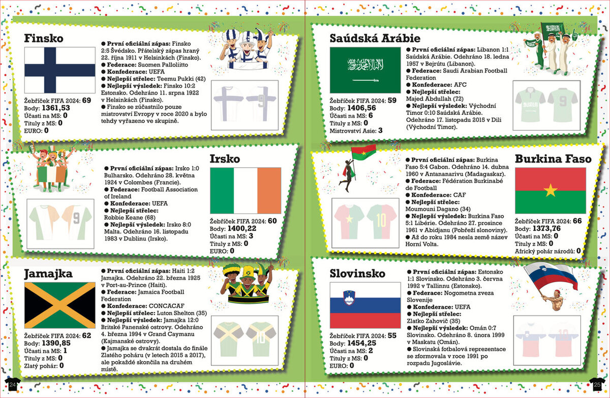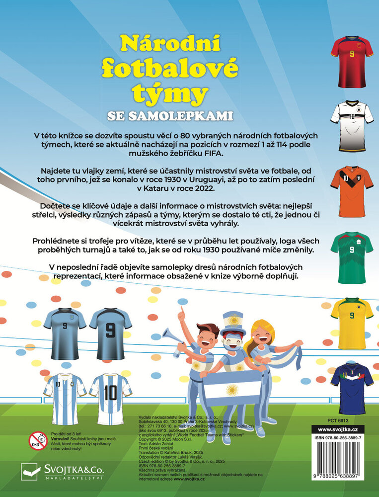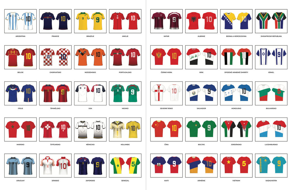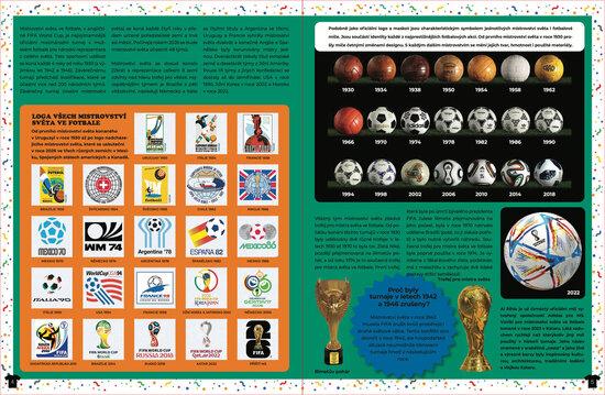 V této knížce se dozvíte spoustu věcí o 80 vybraných národních fotbalových týmech, které se aktuálně nacházejí na pozicích v rozmezí 1 až 114 podle mužského žebříčku FIFA. Najdete tu vlajky zemí, které se účastnily mistrovství světa ve fotbale, od toho prvního, jež se konalo v roce 1930 v Uruguayi, až po to zatím poslední v Kataru v roce 2022. Dočtete se klíčové údaje a další informace o mistrovstvích světa: nejlepší střelci, výsledky různých zápasů a týmy, kterým se dostalo té cti, že jednou či vícekrát mistrovství světa vyhrály. Prohlédnete si trofeje pro vítěze, které se v průběhu let používaly, loga všech proběhlých turnajů a také to, jak se od roku 1930 používané míče změnily. V neposlední řadě objevíte samolepky dresů národních fotbalových reprezentací, které informace obsažené v knize výborně doplňují.