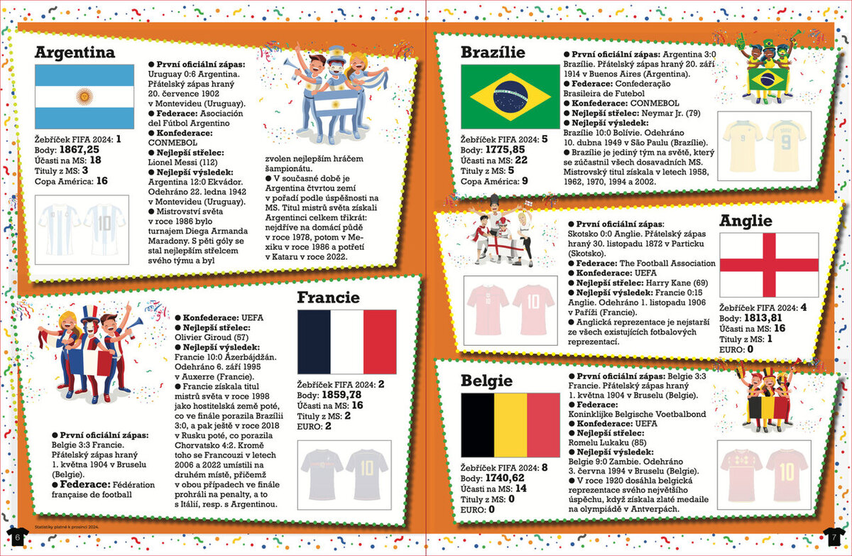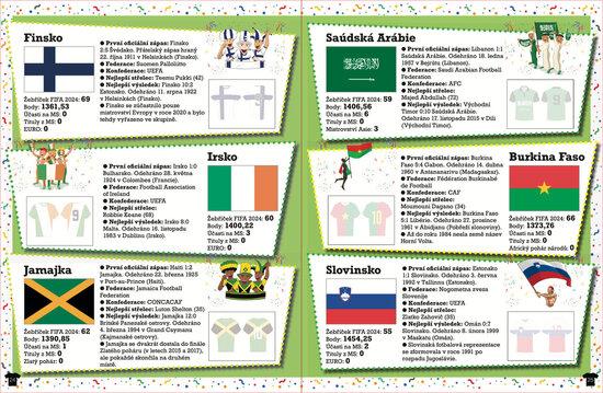 V této knížce se dozvíte spoustu věcí o 80 vybraných národních fotbalových týmech, které se aktuálně nacházejí na pozicích v rozmezí 1 až 114 podle mužského žebříčku FIFA. Najdete tu vlajky zemí, které se účastnily mistrovství světa ve fotbale, od toho prvního, jež se konalo v roce 1930 v Uruguayi, ...