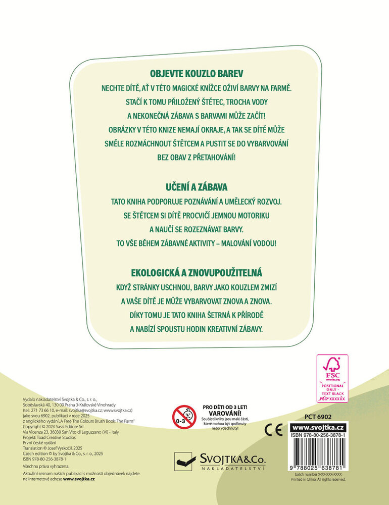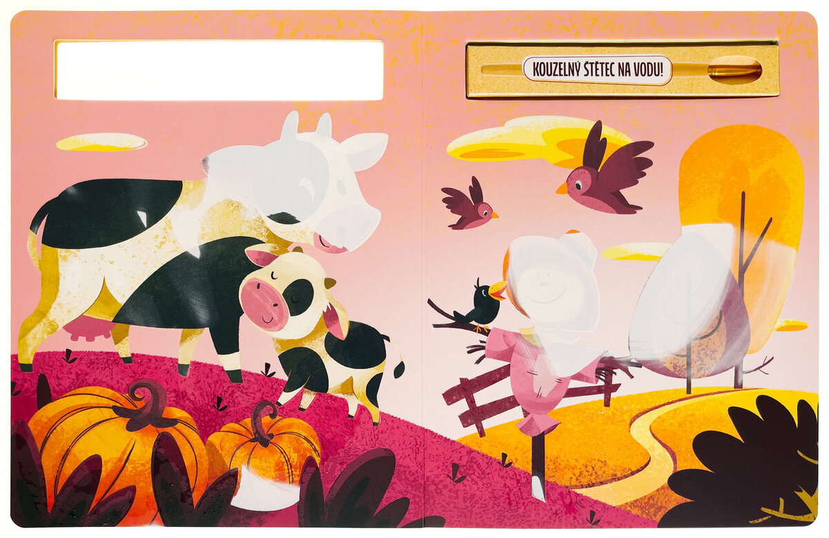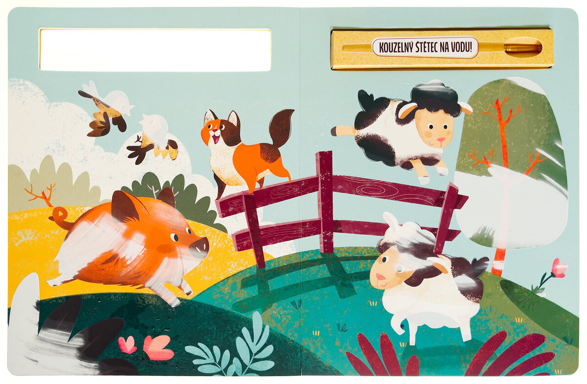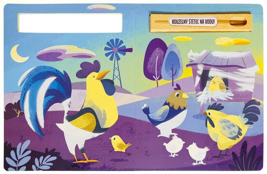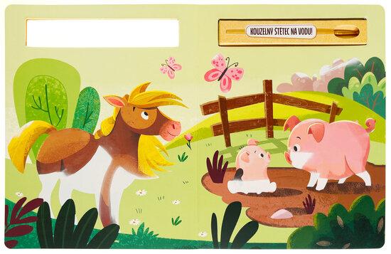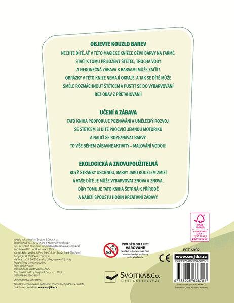 Nechte dítě, ať oživí barvy v této knize se zvířaty z farmy. Stačí k tomu přiložený štětec, trocha vody a nekonečná zábava s barvami může začít! Když stránky uschnou, barvy jako kouzlem zmizí a vaše dítě je může vybarvovat znova a znova. Obrázky v této knize nemají okraje, a tak se dítě může směle rozmáchnout štětcem a pustit se do vybarvování bez obav z přetahování. Se štětcem si dítě procvičí jemnou motoriku a naučí se rozeznávat barvy. To vše během zábavné aktivity - malování vodou!