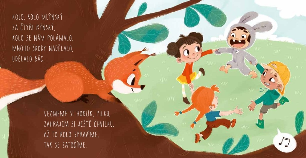 Kolo, kolo mlýnský, Zlatá brána otevřená a další říkanky a písničky čekají na děti v této veselé barevné knížce. Stačí jen zmáčknout tlačítko a zábava může začít! Říkej si, zpívej nebo si zatancuj a zacvič s tímto malým leporelem, kdekoli budeš.