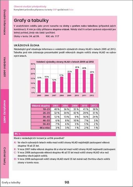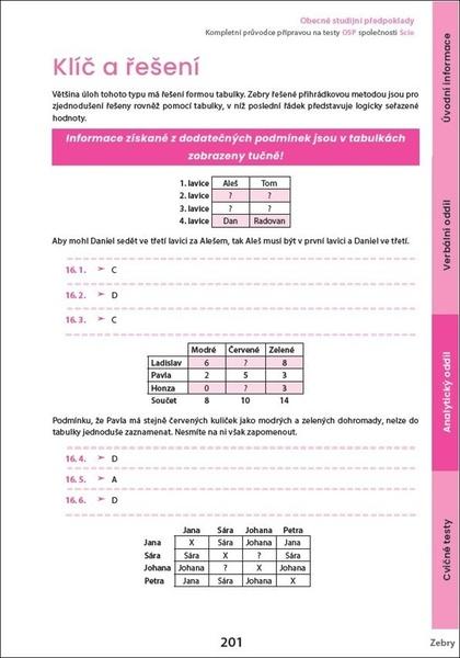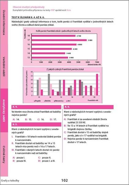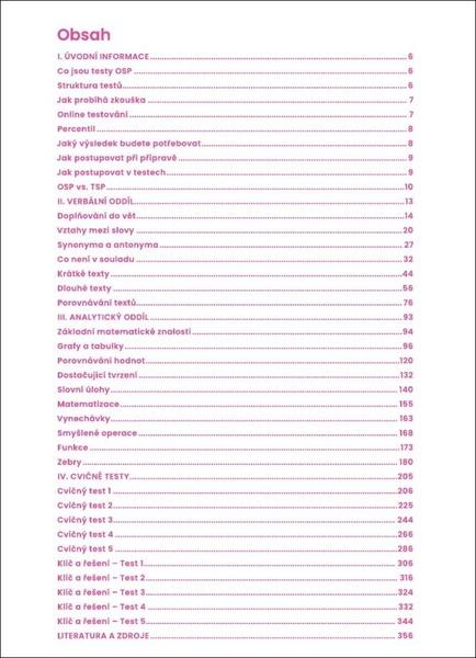 V první části učebnice se seznámíš s tím, co testy Obecných studijních předpokladů jsou, a naučíš se strategie, jak v nich postupovat. Další část se věnuje oběma oddílům testu (verbálnímu a analytickému) a jednotlivým typům úloh. U každého typu úlohy je nejprve detailně vysvětlen postup, jak se dají dané úlohy řešit rychle a efektivně. Potom si ho můžeš ověřit na desítkách řešených příkladů — v celé učebnici je jich víc než šest set. Poslední část publikace je tvořena cvičnými testy.