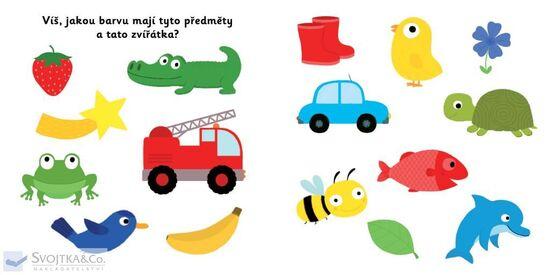 Objevovat svět barev s tímto leporelem je tak zábavné! Jak se jmenuje toto červené ovoce? Co je to za obrovské modré zvíře? Copak žlutého to svítí na obloze? Jak se jmenuje toto zelené zvířátko? Stačí jen vložit prstík do správného otvoru a lehce vysunout, zatáhnout nebo otočit ve směru šipky a ...