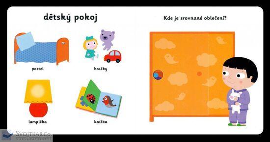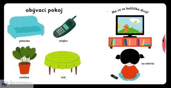 Co všechno máme doma? Na co se díváme v obývacím pokoji? V čem si v kuchyni uvaříme? Kde máme srovnané oblečení? Kam se půjdeme před spaním vykoupat? Nauč se pojmenovat všechny části domu, nábytek a výbavu, která se může nacházet doma. Pestrobarevné ilustrace a posuvné prvky v tomto leporelu rozšiřují dětskou slovní zásobu zábavnou formou. Pohyblivé elementy v této knize rozvíjí jemnou motoriku dítěte a přispívají k živosti ilustrací.