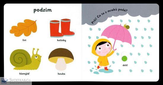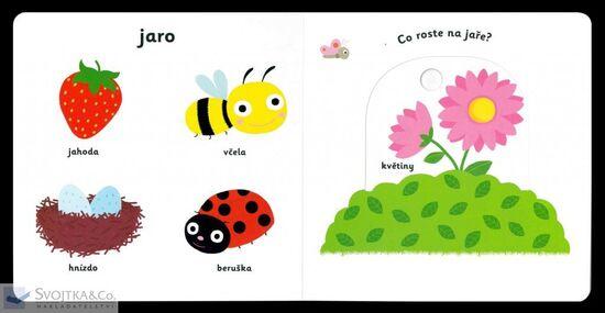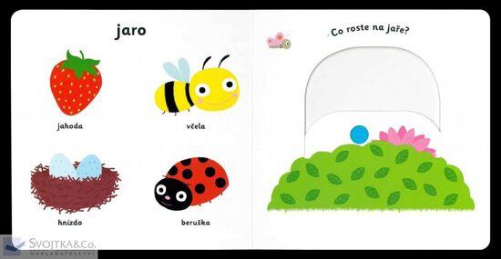Co roste na jaře? Kam se jezdíme v létě koupat? Co to padá z mraků na podzim? A co v zimě? Na čem se v zimě budeme klouzat ze zasněženého kopce? Nauč se rozdíly mezi čtyřmi ročními obdobími a pojmenuj vše, co můžeš vidět na jaře, v létě, na podzim a v zimě. Pestrobarevné ilustrace a posuvné prvky v tomto leporelu rozšiřují dětskou slovní zásobu zábavnou formou. Pohyblivé elementy v této knize rozvíjí jemnou motoriku dítěte a přispívají k živosti ilustrací.