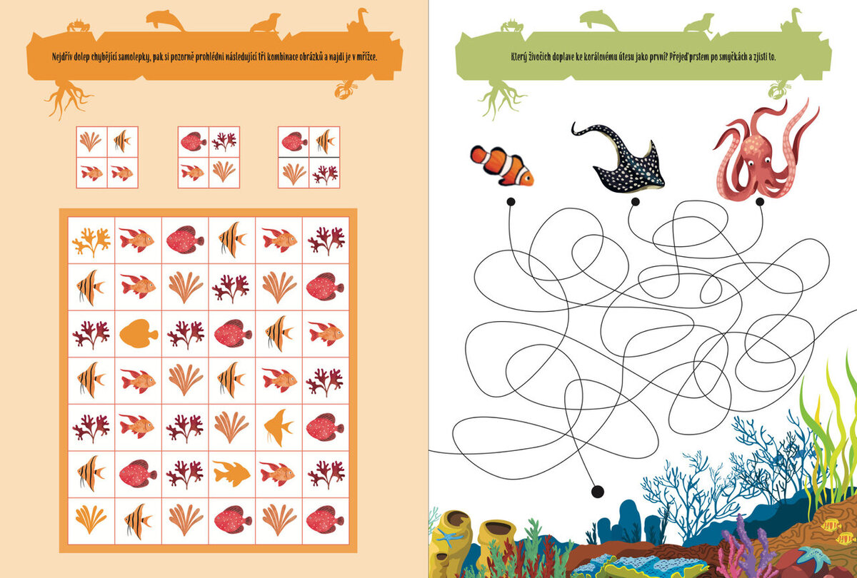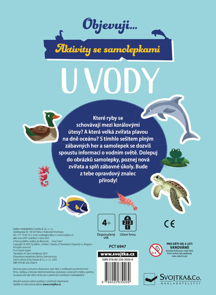 S tímto sešitem plným zábavných her a samolepek se dozvíš spoustu informací o vodním světě. Zjisti, které ryby se schvávají mezi korálovými útesy a která velká zvířata plavou na dně oceánu. Dolepuj do obrázků samolepky, poznej nová zvířata a splň zábavné úkoly. Bude z tebe opravdový znalec přírody! Obsahuje znovupožitelné samolepky.