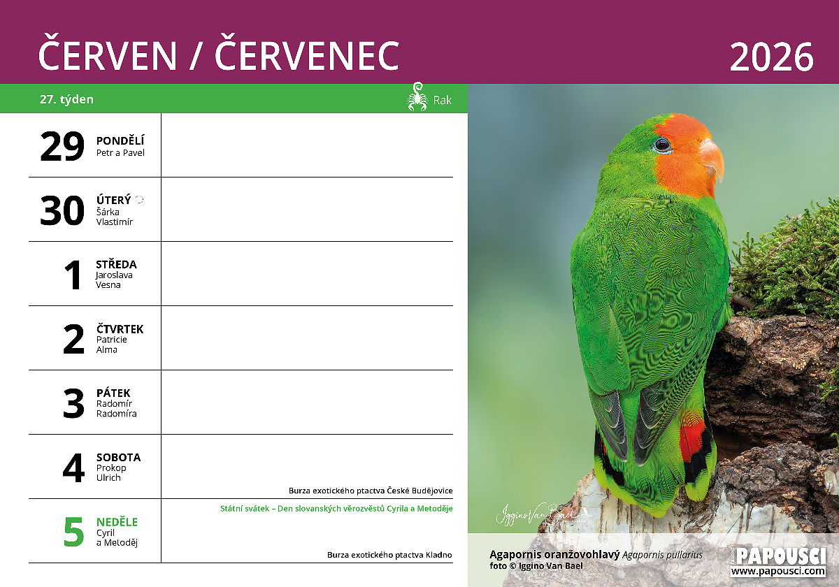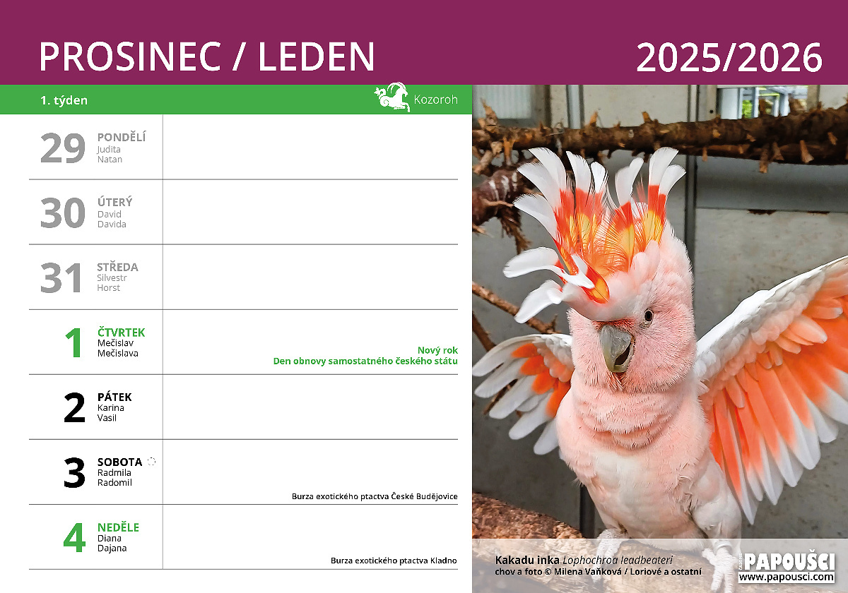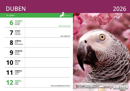 Fascinují vás papoušci? Pak je TÝDENNÍ STOLNÍ KALENDÁŘ s 53 unikátními snímky pestrobarevných opeřenců přesně pro vás. V kalendáriu je dostatečný prostor pro každodenní poznámky a jistě oceníte i extra velké číslice. Najdete v něm česká jména, státní svátky, památné dny, termíny papouščích burz i chovatelských setkání a vše doplňují znamení zvěrokruhu.