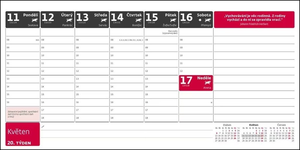 Formát kalendáře: 30,1 x 15 cm Kalendárium: české týdenní sloupcové Počet stran kalendáře: 60 + 2 Stojánek: s plným dnem Prostor pro přítisk: 30,1 x 3,5 cm + daně, roční období, znamení zvěrokruhu, citáty, EU svátky, 3měsíční přehled