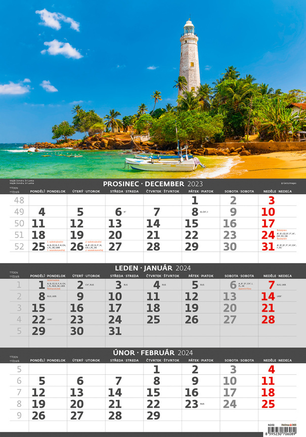 Formát kalendáře: 31,5 x 45 cm Kalendárium: české a slovenské tříměsíční + svátky vybraných evropských států (CZ / SK / A / B / D / F / H / CH / I / PL / RUS / UKR) Rozsah kalendáře: 12 listů Prostor pro přítisk: 31,5 x 7 cm