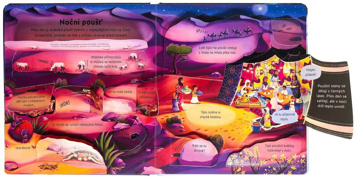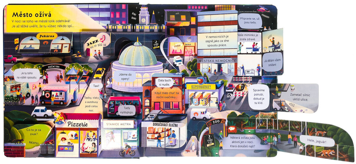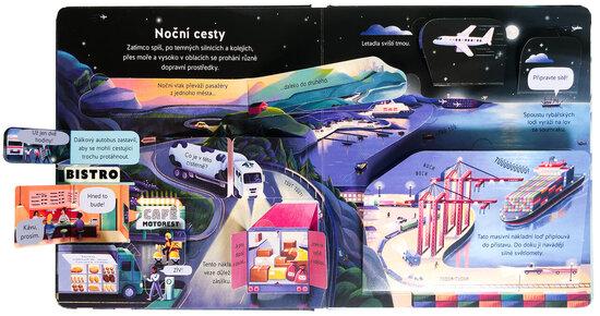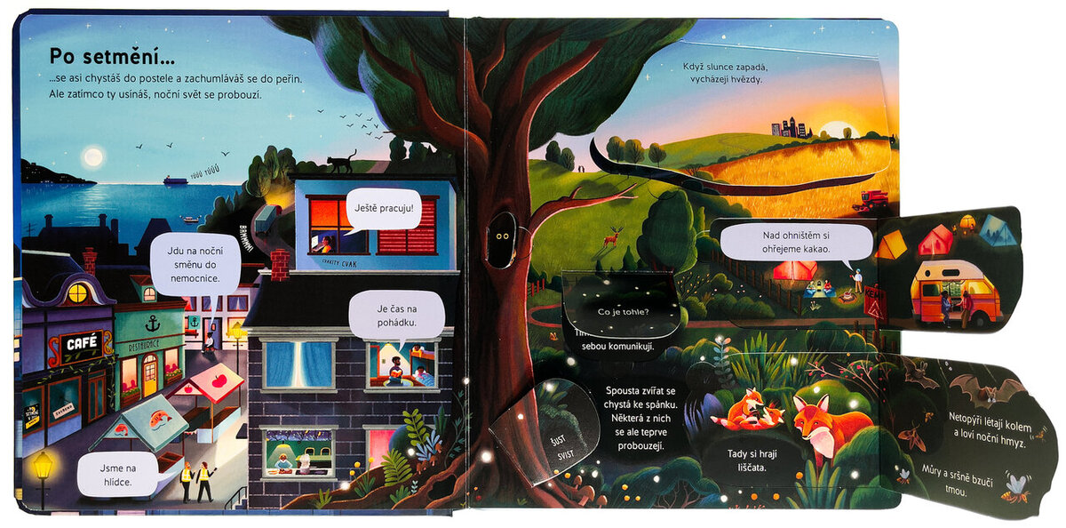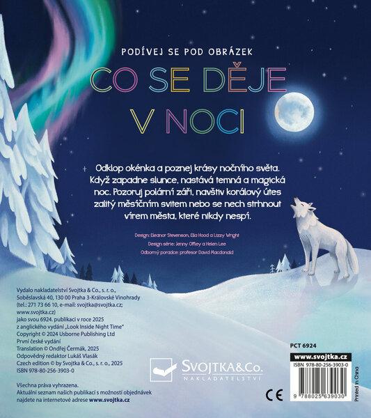 Odklápějte s dětmi okénka této bohatě ilustrované encyklopedie a poznávejte společně krásy i záhady nočního světa. Když zapadne slunce, nastává temná a magická noc… Pozorujte v propracovaných ilustracích polární záři, ponořte se ke světélkujícímu korálovému útesu anebo se nechte strhnout vírem velkoměsta, které nikdy nespí! Výstižné popisky na stránkách i pod okénky vaše děti zaujmou a ponaučí o tom, co se děje v noci.