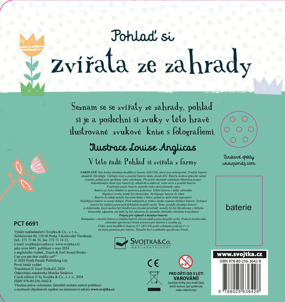 Vítej na zahradě a seznam se s jejími obyvateli. Pohlaď si žábu, čmeláka nebo kočku a poslechni si zvuky, které vydávají. Dozvíš se o zvířatech ze zahrady pár zajímavostí a podíváš se, jak žijí. Tato zvuková kniha s hmatovými prvky je ideální pro menší děti, které si s její pomocí procvičují většinu smyslů naráz.