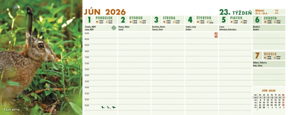 Stolový týždňový kalendár s originálnymi fotgrafiami divých zvierat s informáciami o ich spôsobe života, doplnený piktogramami o love. S prehľadným mesačným kalendáriom, hodinovým delením, fázami Mesiaca, východmi a západmi Slnka i Mesiaca, sviatkami okolitých krajín štátov EÚ, slovenskými a českými menami (plus netradičné mená).