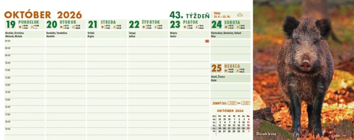 Stolový týždňový kalendár s originálnymi fotgrafiami divých zvierat s informáciami o ich spôsobe života, doplnený piktogramami o love. S prehľadným mesačným kalendáriom, hodinovým delením, fázami Mesiaca, východmi a západmi Slnka i Mesiaca, sviatkami okolitých krajín štátov EÚ, slovenskými a českými ...
