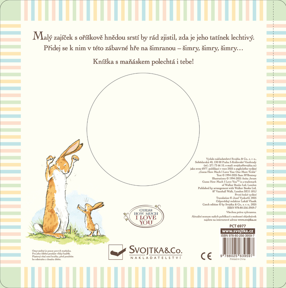 Táta zajíc s oříškově hnědou srstí a jeho malý synek si před spaním hrají na šimranou – a ty se můžeš přidat! Tato roztomilá knížka s maňáskem ti umožní stát se součástí večerního mazlení. Šimrej zajíčka na čumáčku, pod bradičkou i na packách a pomoz mu zjistit, kde ho to nejvíc lechtá. Příběh plný lásky, něhy a smíchu, ideální pro společné čtení před usnutím. Maňásek zabudovaný přímo do knihy přináší zábavné, interaktivní čtení, které děti i rodiče prostě milují.