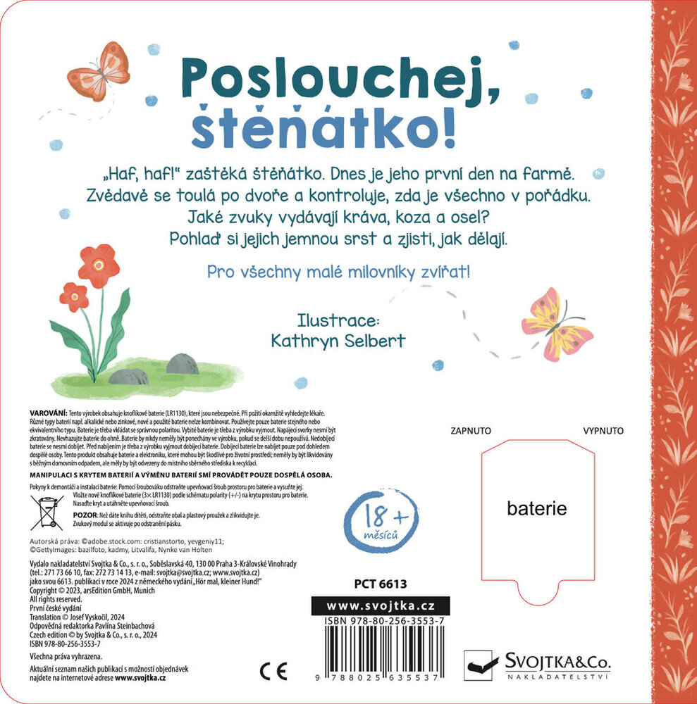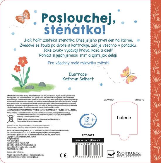 „Haf, haf!“ zaštěká štěňátko. Dnes je jeho první den na farmě. Zvědavě se toulá po dvoře a kontroluje, zda je všechno v pořádku. Jaké zvuky vydávají kráva, koza a osel? Pohlaď si jejich jemnou srst a zjisti, jak dělají. V knize na tebe čekají zvířecí kamarádi, z nichž některé si můžeš dokonce pohladit díky hmatovým prvkům, a poslechnout si skutečné zvířecí zvuky. Pro všechny malé milovníky zvířat!