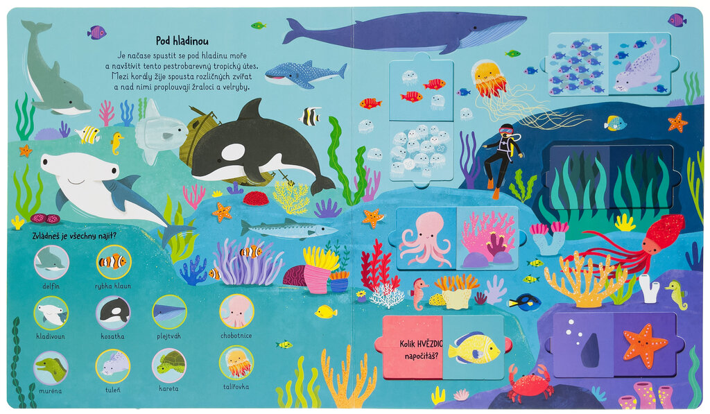 V této knize s posuvnými okénky se děti v 5 různých prostředí seznámí se zvířaty z celého světa. Každé prostředí je krátce uvedeno společně s úkolem na hledání nejrůznějších zvířat. Jasné ilustrace a popisky pomohou dětem lépe poznat říši zvířat a seznámit se s ní. Za posuvnými okénky se poté ukrývají úkoly na počítání a pozornost. Tato interaktivní kniha s roztomilými ilustracemi je ideální volbou pro všechny milovníky i milovnice zvířat a přírody.