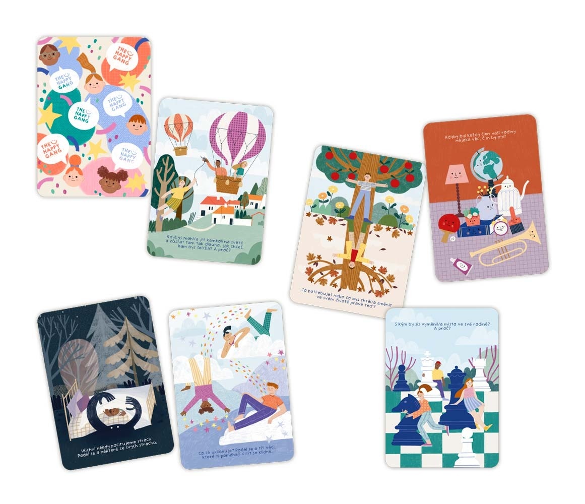 Za portugalskou značkou The Happy Gang je parta nadšenců a odborníků, která otevírá svět osobního rozvoje, emocí, komunikace a vztahů prostřednictvím zábavných her. Hravě zpracované karty jsou pomůckou, která inspiruje, motivuje a přirozeně otevírá důležitá témata. Pomáhají tak dětem růst, porozumět sobě i ostatním a dospělým pochopit, co se dětem honí hlavou.