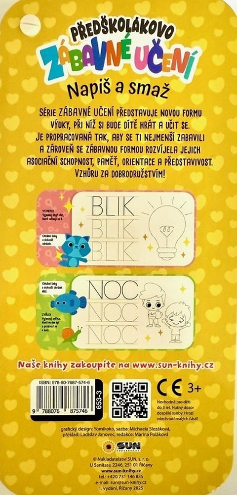 Kniha má praktický a příjemný formát, je k ní připojen mazací fix. Děti mohou tahy snadno smazat, opravit a opakovat úkoly znovu. Celá koncepce je chytrá, zábavná a šetrná.