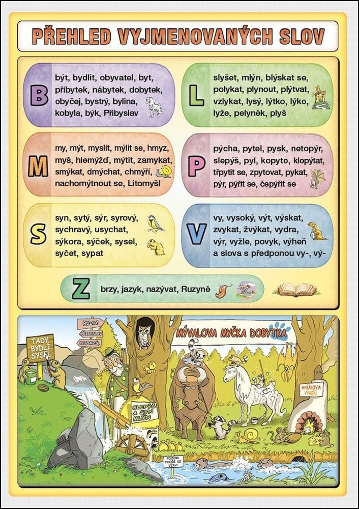 Přehledně zpracovaná ilustrovaná vyjmenovaná slova a slova od nich odvozená v praktickém formátu harmoniky. Součástí je také vysvětlení pravopisných rozdílů u dvojic, které se často pletou.