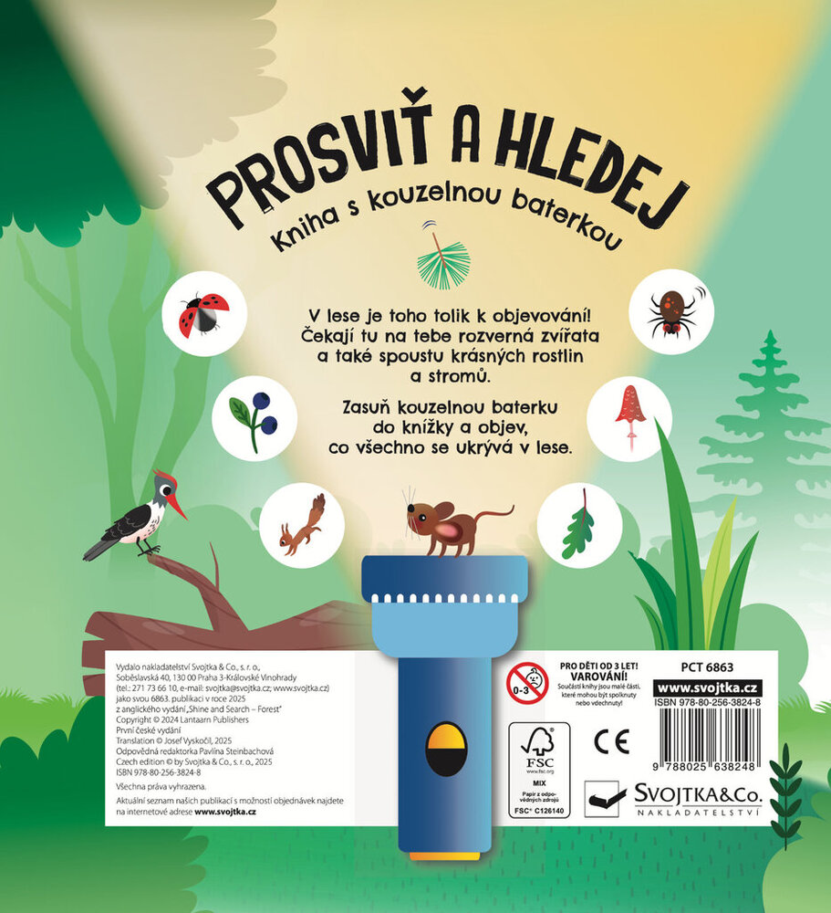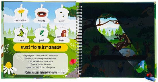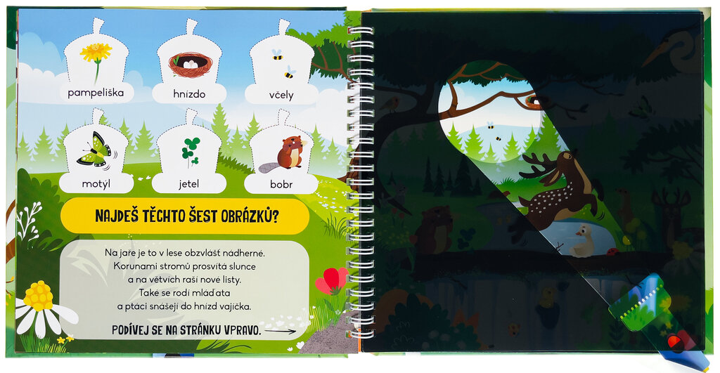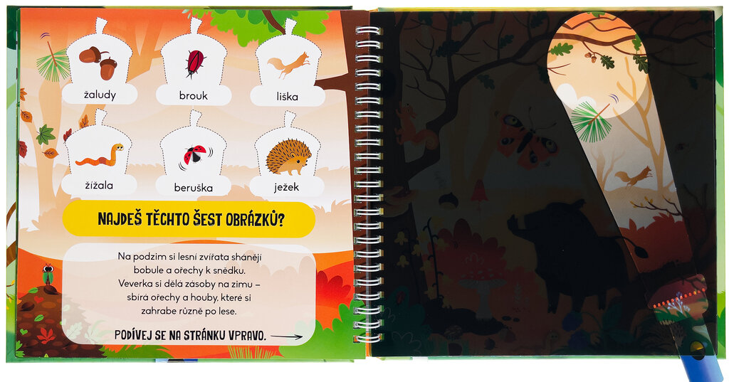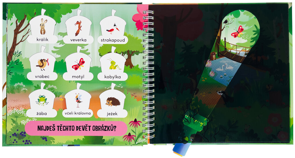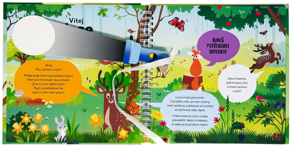 V lese je toho tolik k objevování! Čekají tu na tebe rozverná zvířata a také spoustu krásných rostlin a stromů. Na stránkách hledej ukryté obrázky a zjisti o lese a zvířatech zajímavé informace. Stačí jen zasunout baterku pod tmavou folii a hned všechno uvidíš.