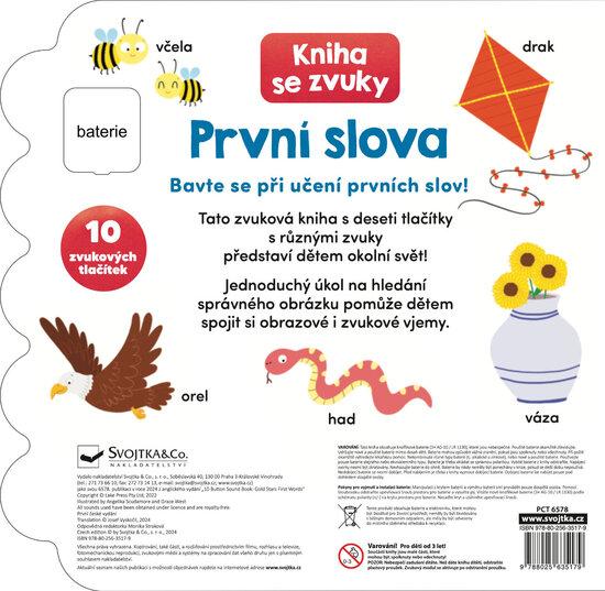 Ať už jste se svým děťátkem doma, v parku, ve městě nebo třeba v zoo, všude je spoustu věcí a zvířat k pojmenování. Bavte se při učení prvních slov s touto knihou se zvuky. Stiskněte tlačítko na zvukovém panelu vpravo a poslechněte si, jaký zvuk vydává kočka, slon, auto nebo kůň. Jednoduchý úkol na hledání správného obrázku pomůže dětem spojit si obrazové a zvukové vjemy.